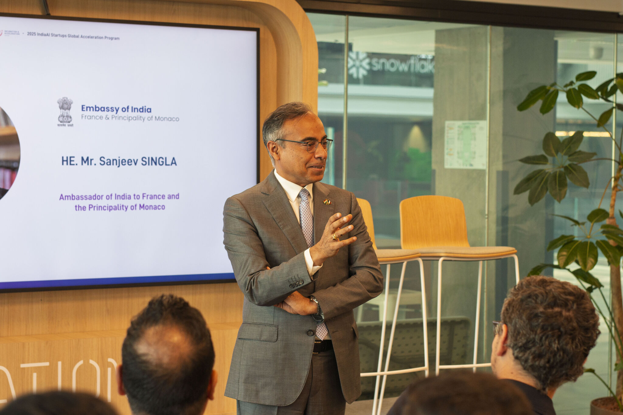 The Indian Ambassador, Sanjeev Kumar Singla, delivered an inspiring speech, celebrating the collaboration between India and France on AI innovation, encouraging the startups towards global leadership, and reaffirming India's commitment to excellence in the field.