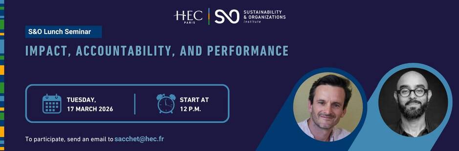 2026-03-17T12:00:00 2026-03-17T14:00:00 S&O lunch Seminar on impact, accountability, and performance You are warmly invited to the Sustainability & Organizations Institute’s  lunch seminar, on Tuesday March 17, 2026  at 12:00 pm in Room T001, HEC Paris Campus. Jouy-en-Josas