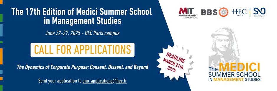 The S&O Institute of HEC Paris is pleased to announce the organization of the 17th edition of the Medici Summer School in Management Studies, for doctoral students and young researchers, which will be held at HEC Paris campus, June 22 - 27, 2025.